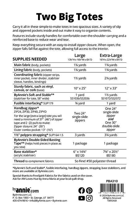 Carry it all with Two Big Totes! This versatile pattern includes instructions for creating two spacious totes—large and extra-large—perfect for everything from beach days and grocery runs to weekend getaways and sewing retreats. The wide openings of these totes make it easy to pack and access your essentials, while a variety of slip and zippered pockets inside and out keep your items organized.